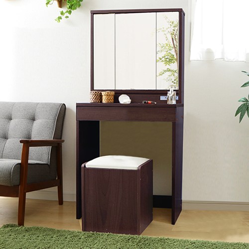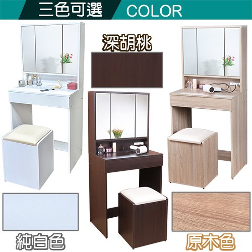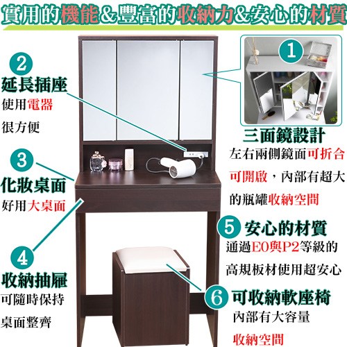 《C&B》黛薇日式時尚三面鏡化妝桌,是台灣生產外銷日本的實用化妝桌,材質採用符合先進國家政府規定的E0與P2等級板材,符合安心家具的規定。
