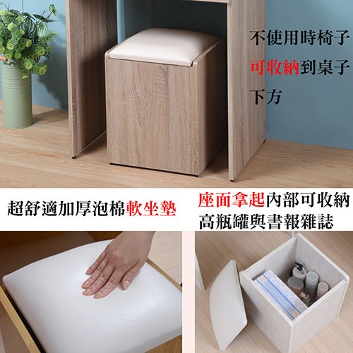 搭配化妝收納椅,高度足足有44公分,加上使用 加厚泡棉 ,讓您使用起來舒服耐坐,坐墊掀起內部有 超大收納空間,放置書報雜誌或高的瓶罐都很適合。