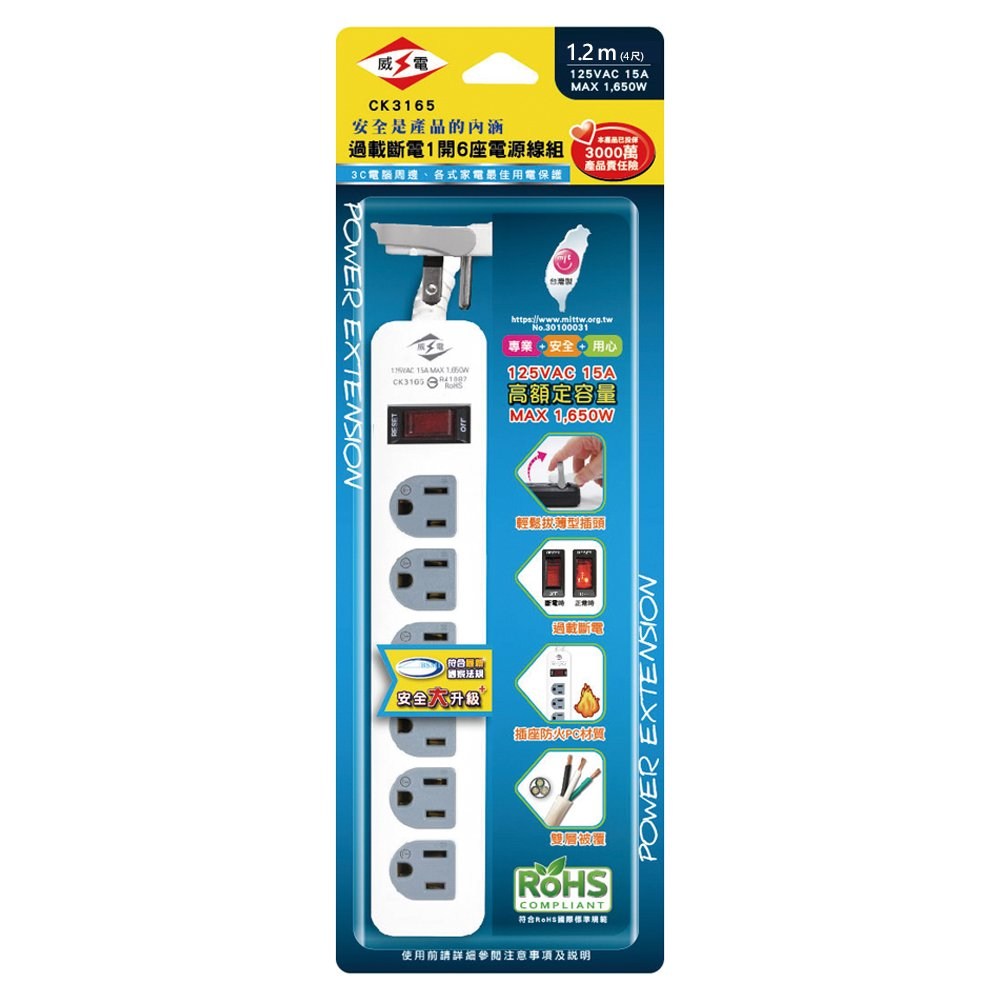 【威電】CK-3165 3孔1開6座 電腦線 延長線 4尺/6尺/9尺(拉環插頭 好拔 過載斷電 電源線組)