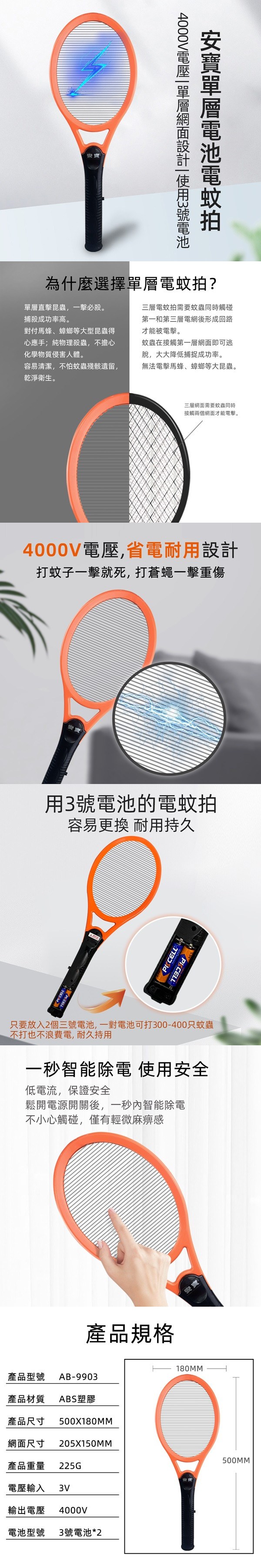 安寶 強力單層電子電蚊拍 AB-9903 / 平面單層電擊網