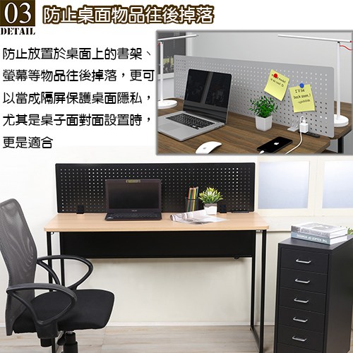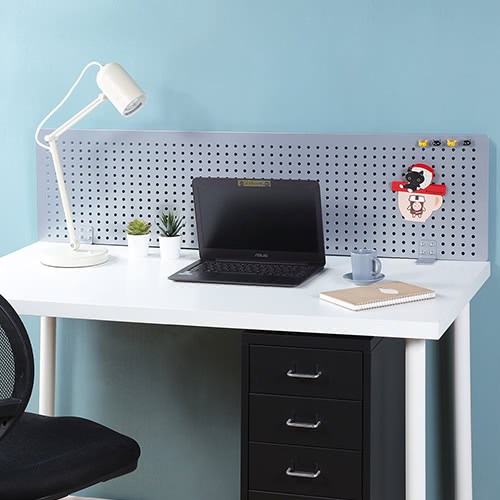 《C&B》路蓋特桌上洞洞鐵板隔屏,安裝在桌子的後方,可以當成佈告欄,您可以輕易將功課表、備忘錄、生活照、生活小札等用磁鐵吸附在佈告欄上,讓各種日常生活上需要叮嚀的事項都能隨時展現在眼前;如果您使用桌子的位置不是面對牆邊使用的話,您更需要《C&B》路蓋特桌上洞洞鐵板隔屏,除了防止放置於桌面上的書架、螢幕等物品掉落以外,更可以隨時隨地當成隔屏保護桌面隱私,尤其是桌子面對面設置時,更需要本商品來保護自我的隱私,營造一個私人小空間的氛圍,上班族也很適用喔!(適用於桌面厚度38mm以內的桌子)。