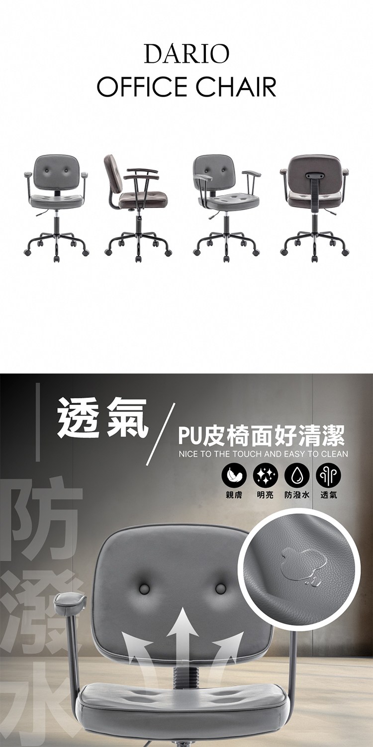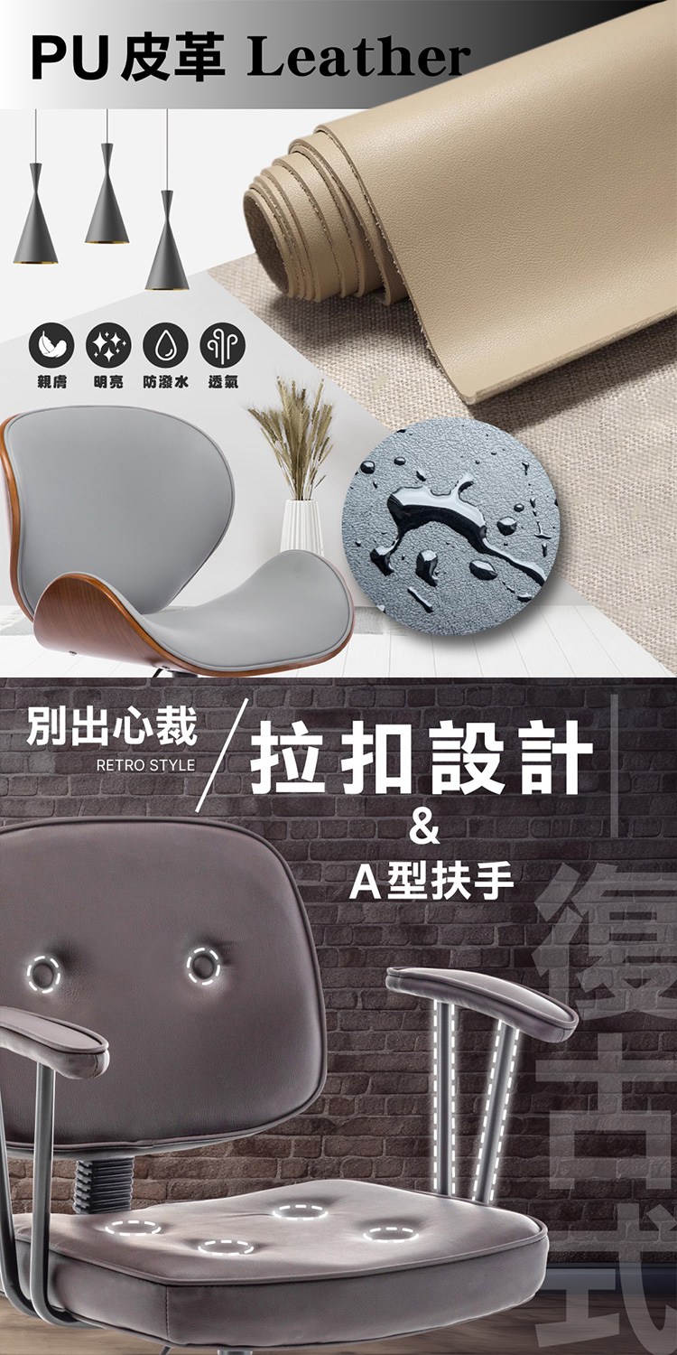 台灣與歐美同步販售、美規設計,防潑水PU皮座面,觸感佳易清潔,椅背及椅面搭配復古式拉扣設計,