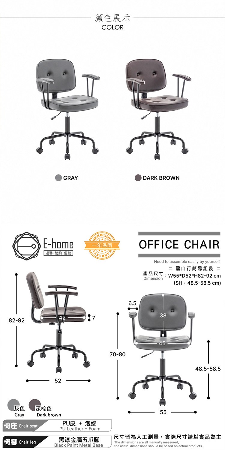 產品尺寸:W55*D52*H82-92 cm (SH:48.5-58.5 cm)