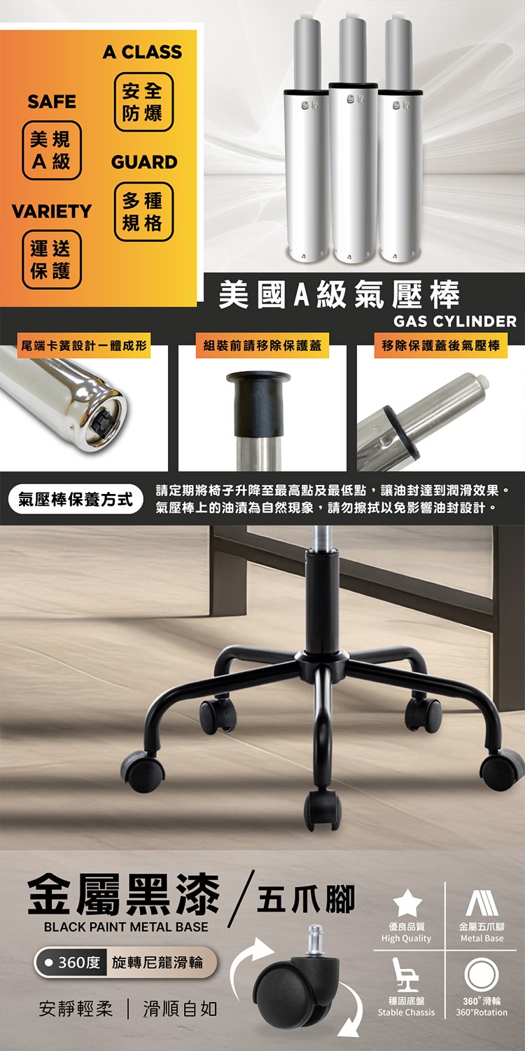 金屬黑漆五爪腳,穩固且承重強,360°旋轉尼龍滑輪、靈活且耐磨,打造您的個性生活,成就生活品味。