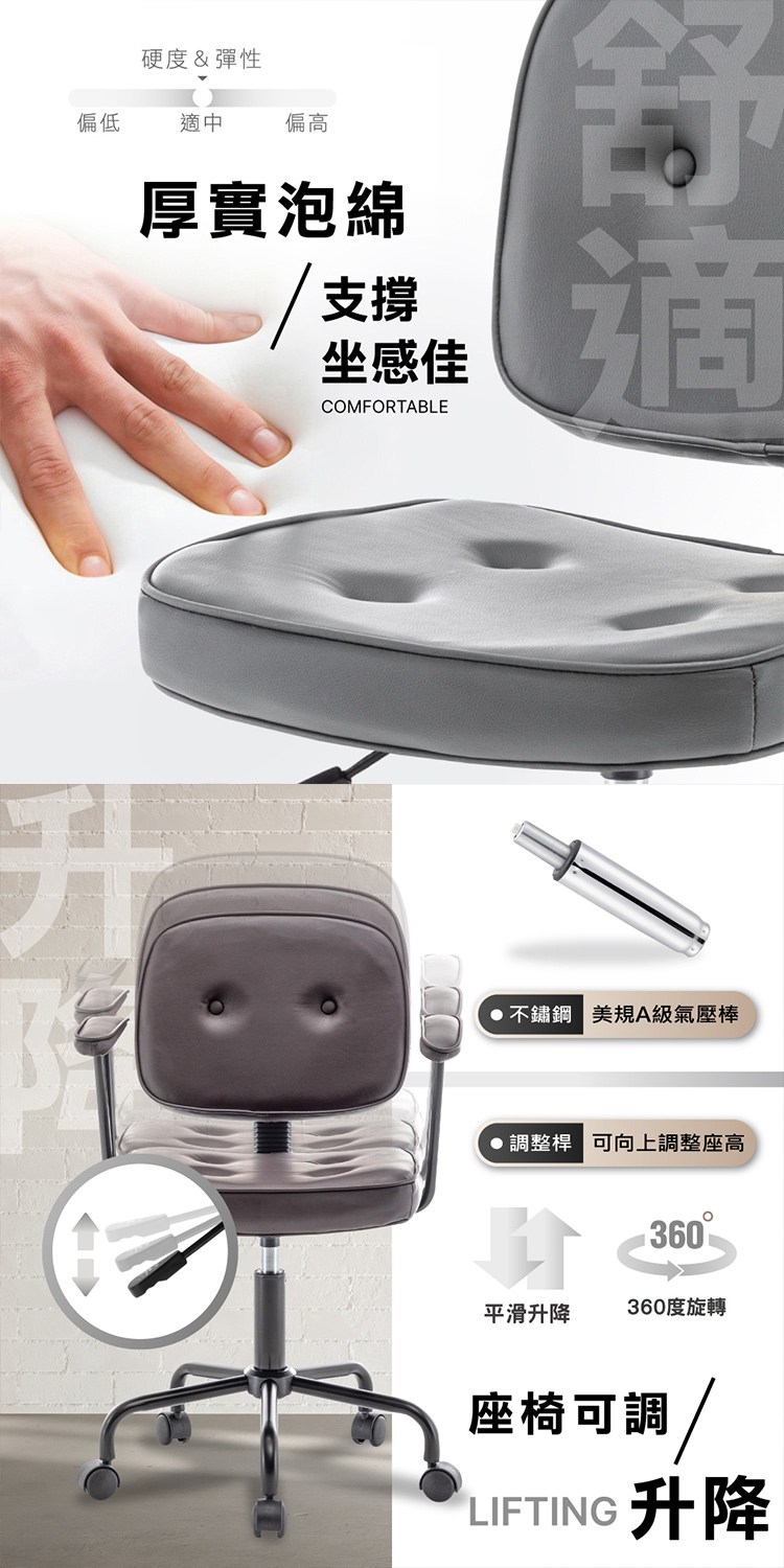 獨特黑漆A型扶手造型供雙手倚靠,厚實泡棉坐墊、提供支撐坐感佳,配備美規A級氣壓棒、安全升降,