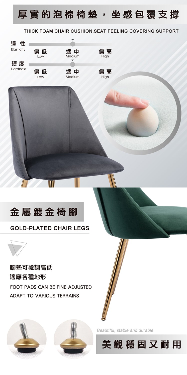 厚實的泡棉椅墊,坐感包覆支撐,金屬鍍金椅腳,美觀穩固又耐用,配可調式腳墊*4pcs、保護地板,
