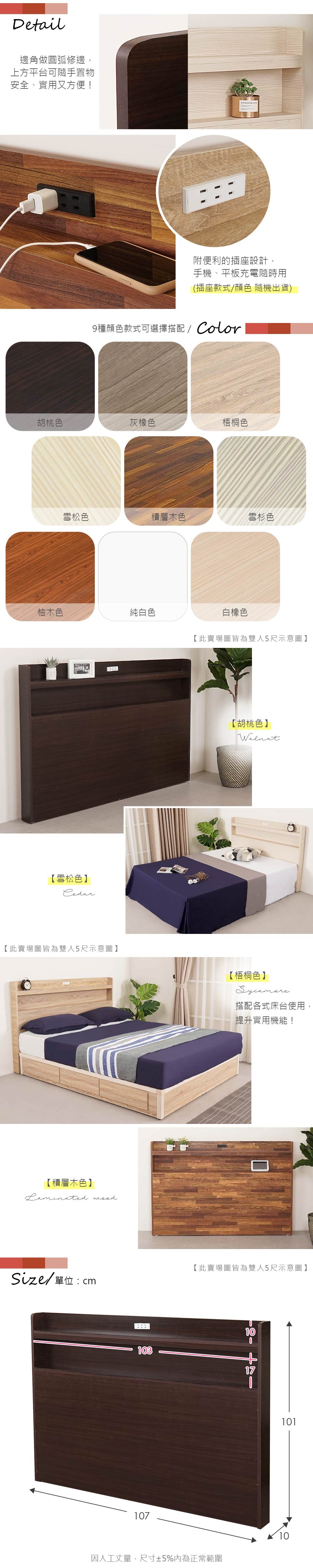 Homelike 喜家居雙人5尺附插座床頭片(多色可選)(2152)雪杉色