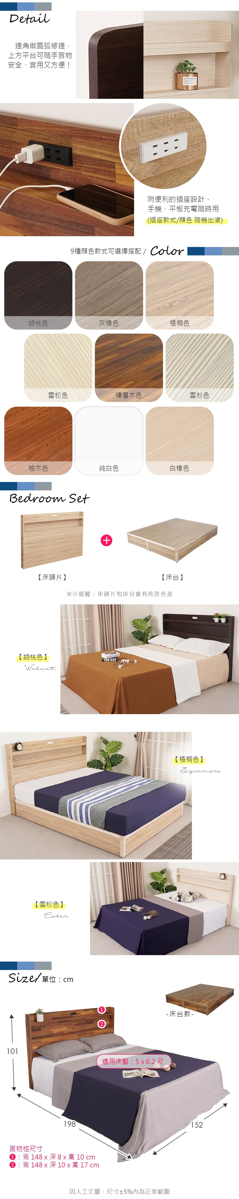 源氏木語西雅圖橡木原木色斜靠雙人5尺150x190夜燈低舖床架 Y90B28 (H014324397)