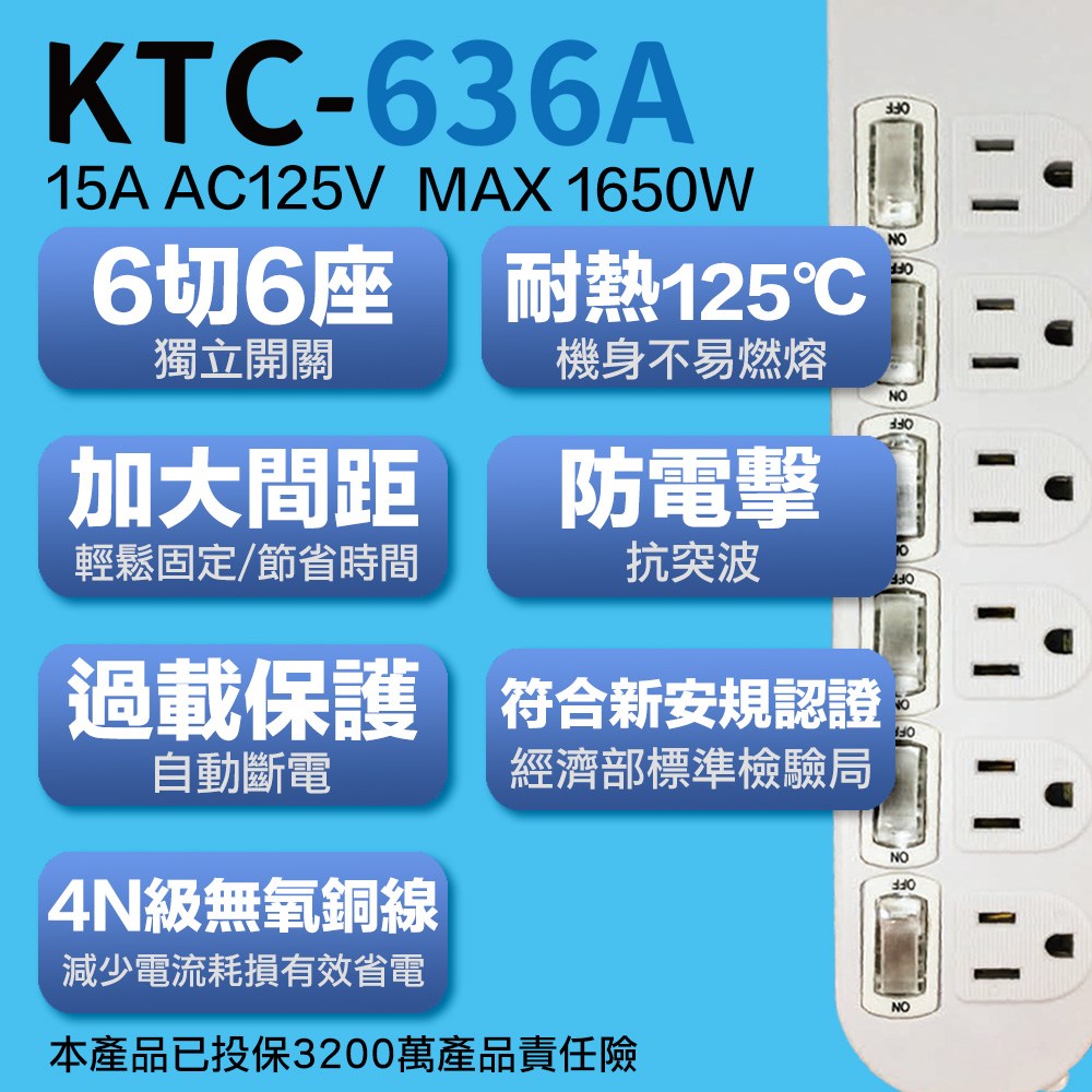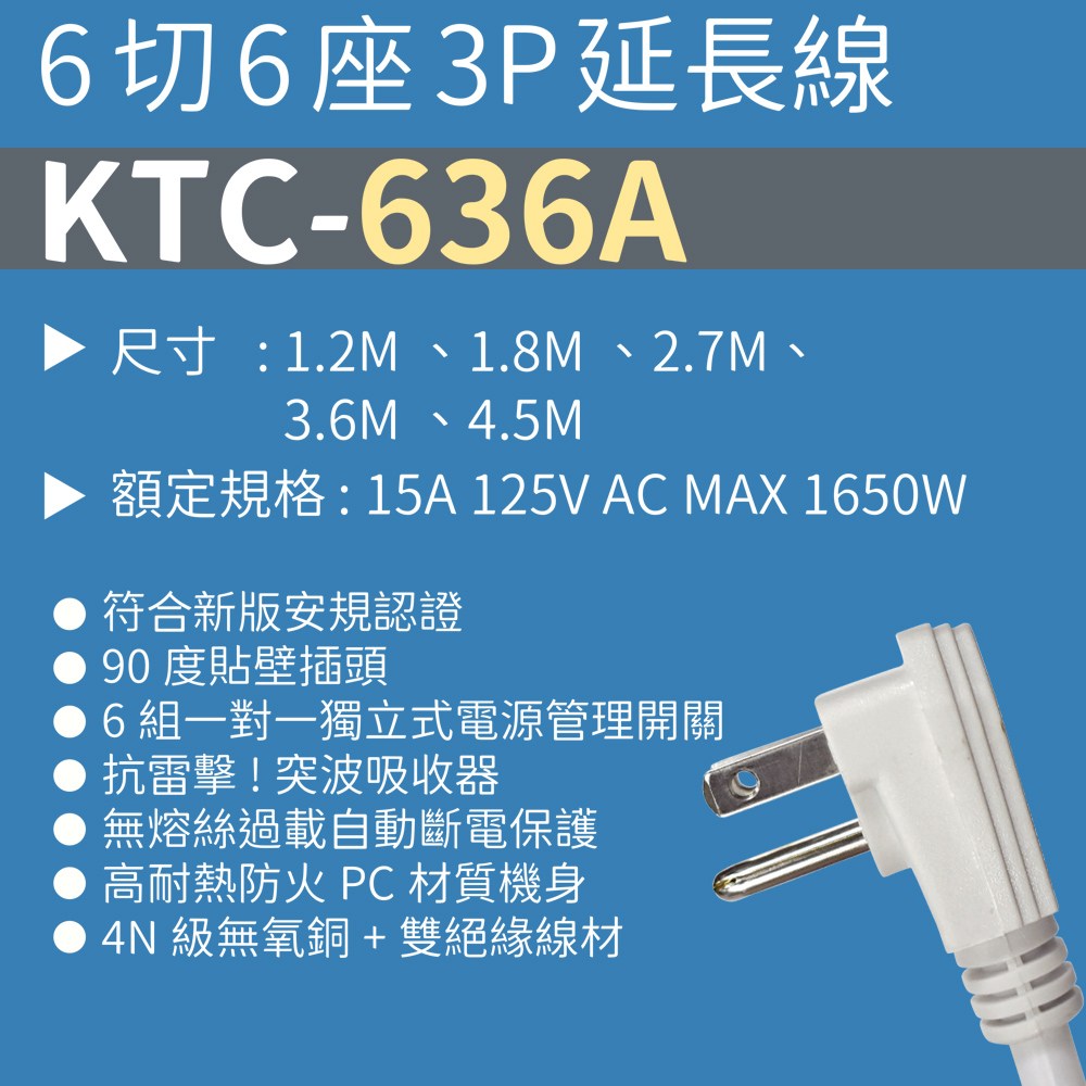 【博銓科技BC】KTC-636A-12 6切6座3孔3.6M/12尺 防雷擊 延長線(過載斷電保護/固定掛孔)
