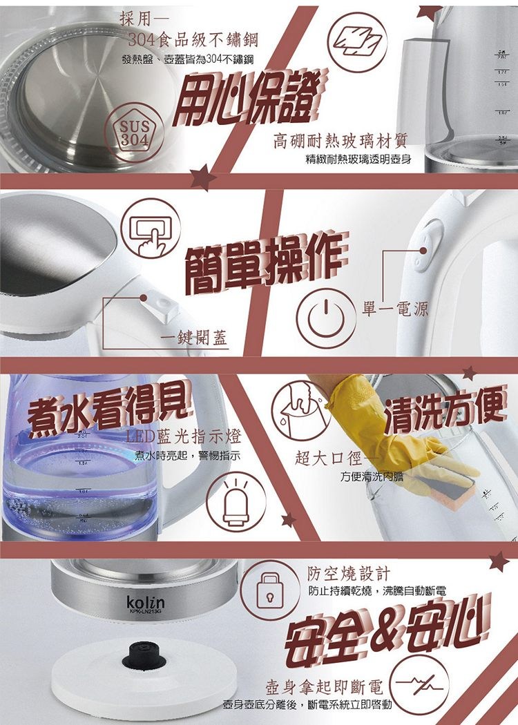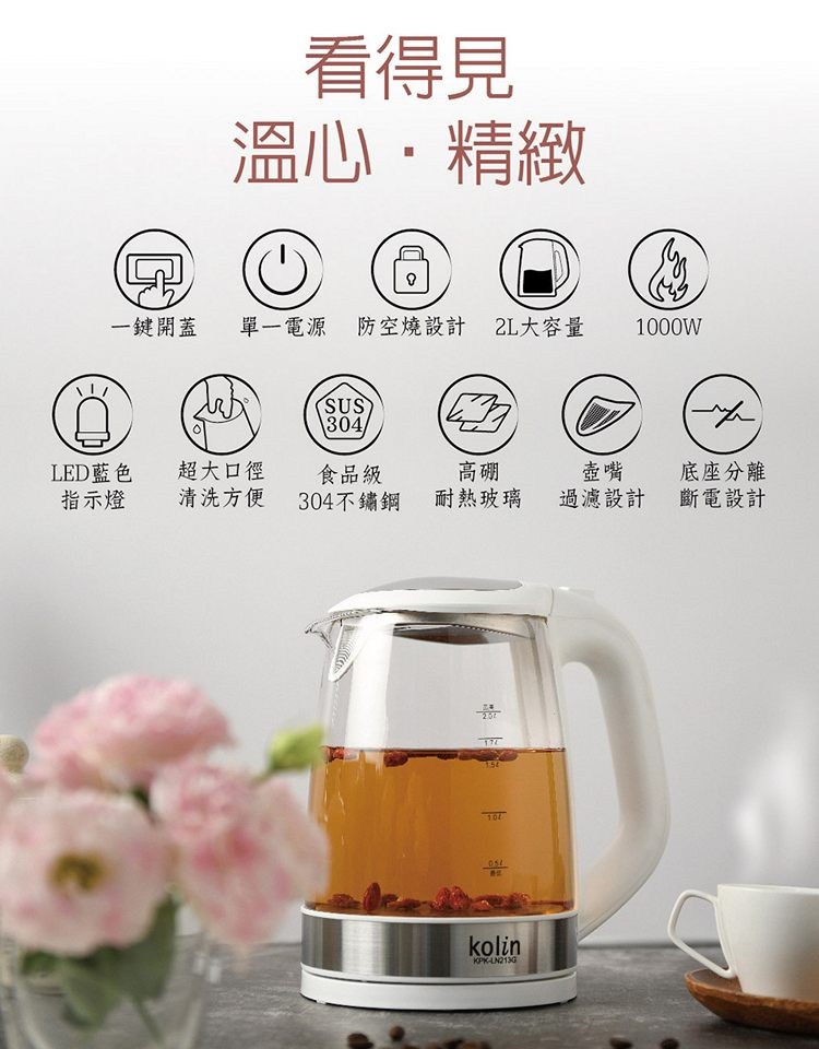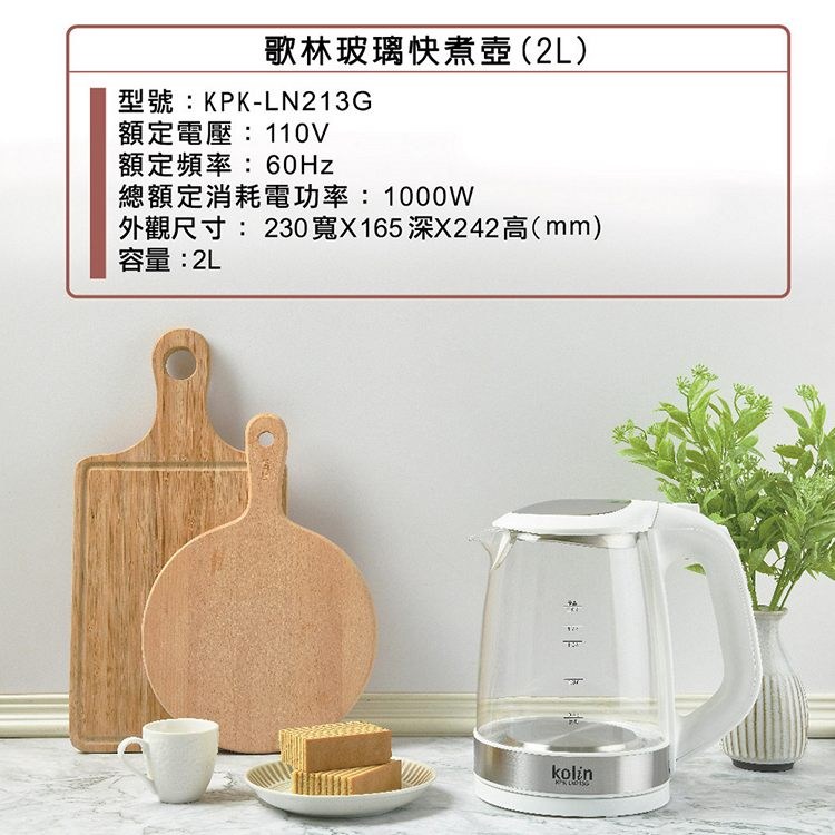 Kolin歌林 2L玻璃快煮壺.電茶壺.熱水壺 KPK-LN213G