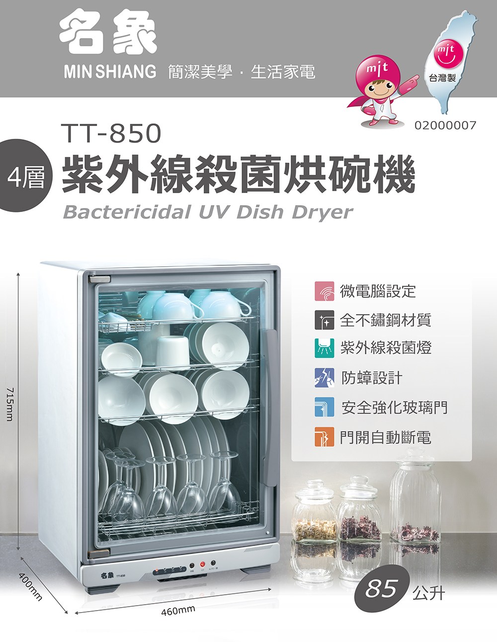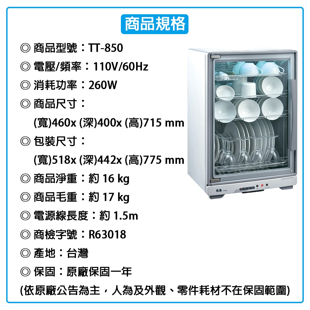 MIN SHIANG名象 85公升全不鏽鋼四層紫外線烘碗機 TT-850 (台灣製造)