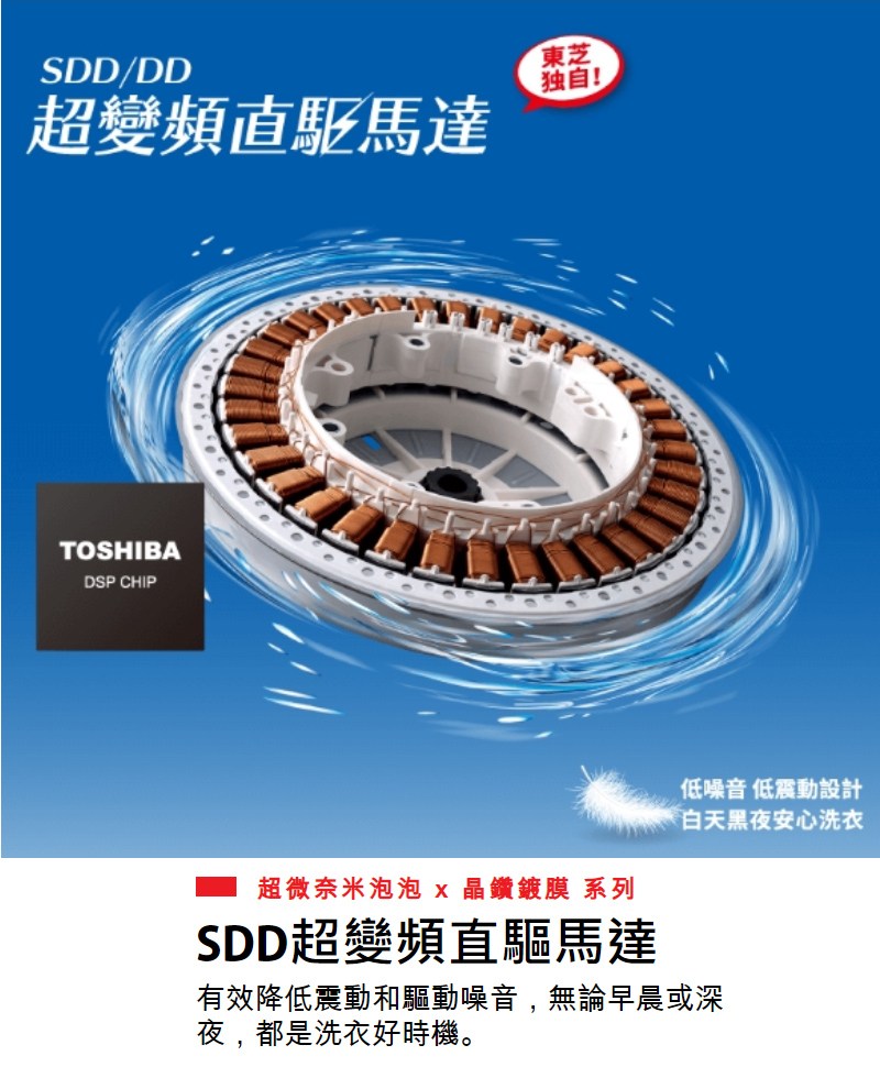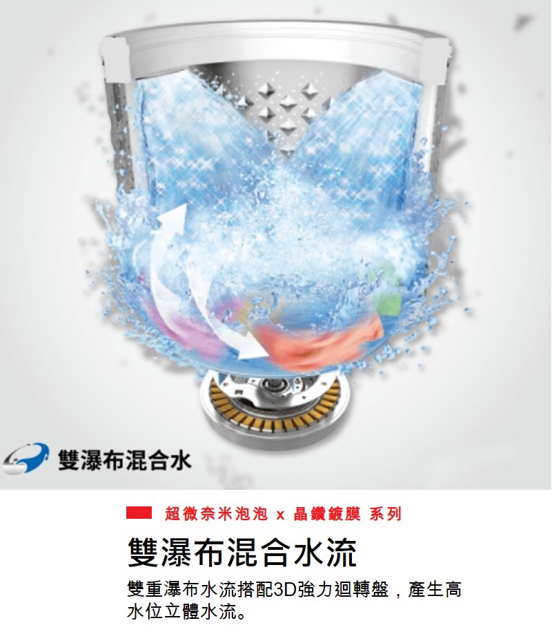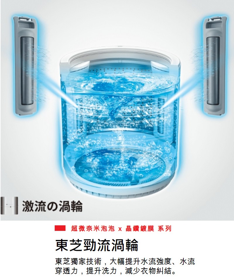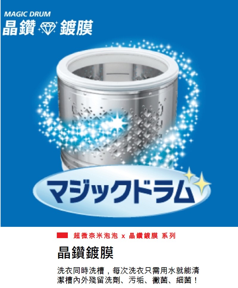 東芝旗艦獨家,超神奇洗淨技術,奈米尺寸泡泡深入衣物纖維,有效減少衣物汗漬、皮脂、黃斑殘留! 晶鑽鍍膜洗衣同時洗槽,每次洗衣只需用水就能清潔槽內外殘留洗劑、污垢、黴菌、細菌,帶給全家人更好的潔淨體驗!