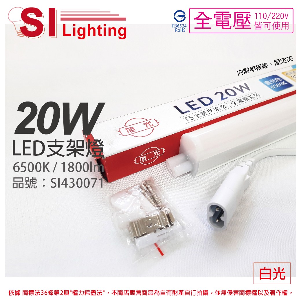 6入 旭光 LED 20W 白光 4尺 全電壓 兩孔型 支架燈
