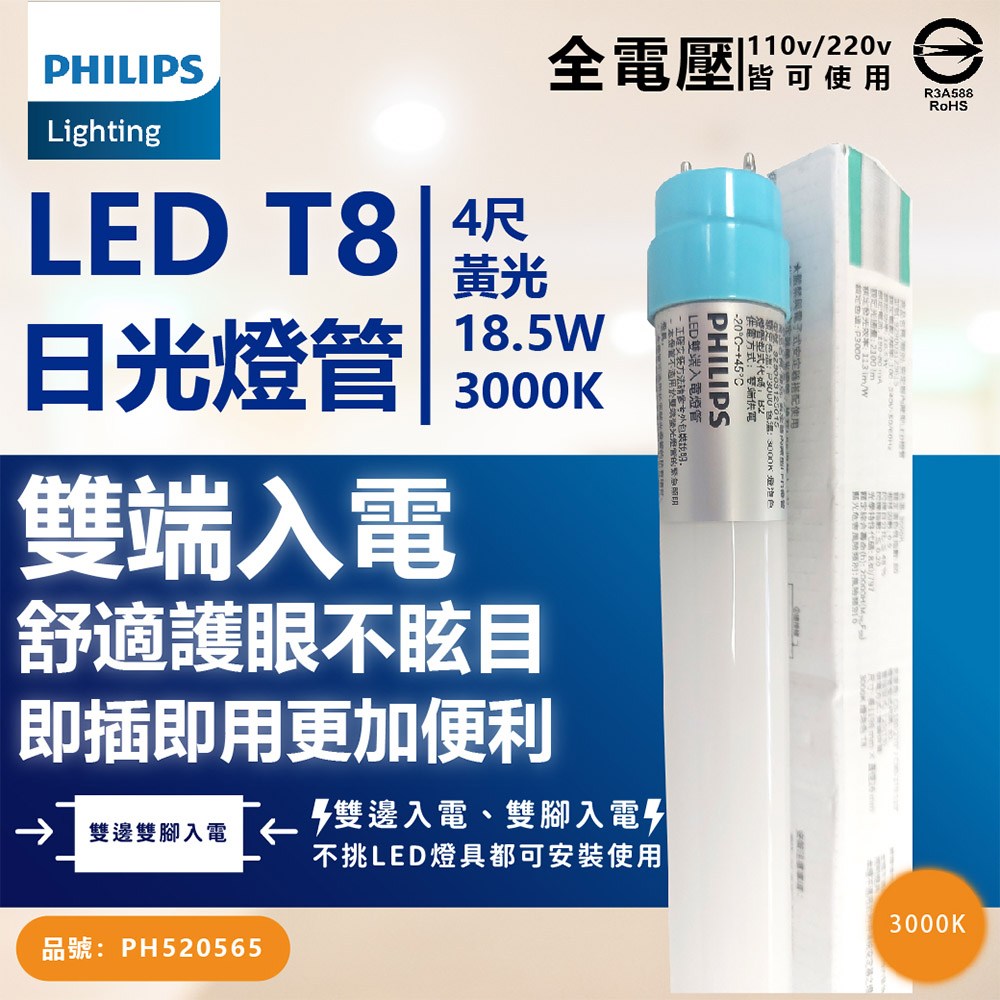 4入 PHILIPS飛利浦 LED T8 4尺 18.5W 黃光 雙端入電 燈管