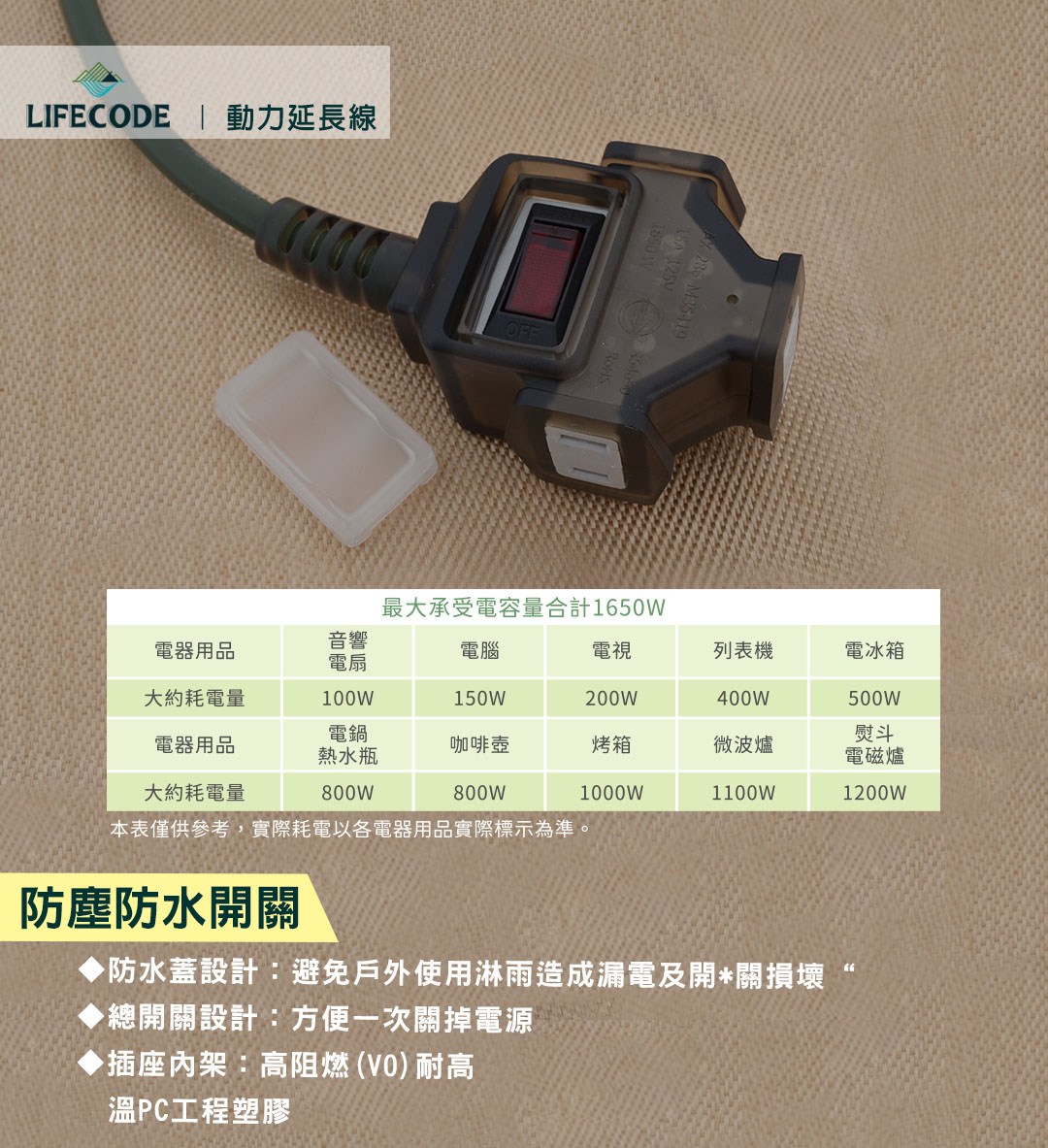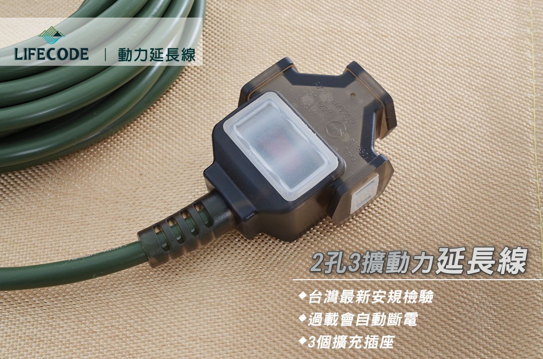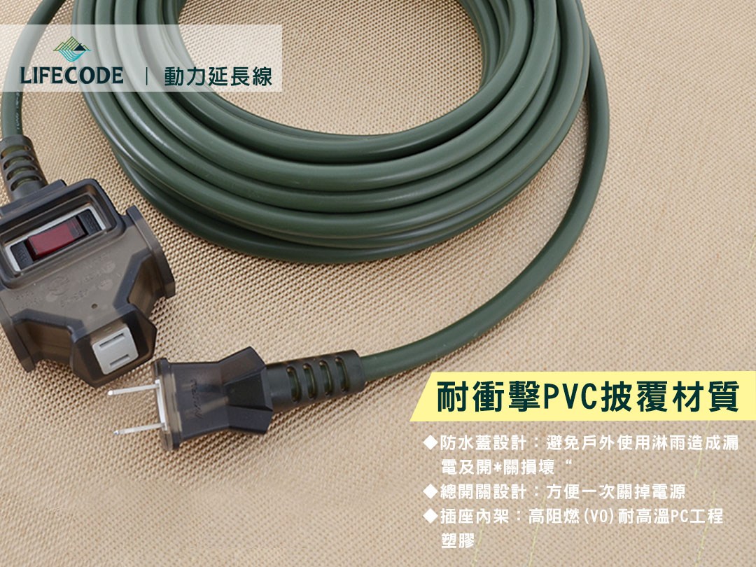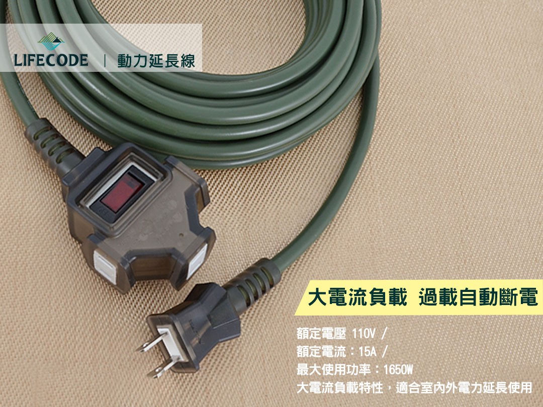 【LIFECODE】《2P1擴3插1開》動力延長線-10米(附提袋) 軍綠12310374-1