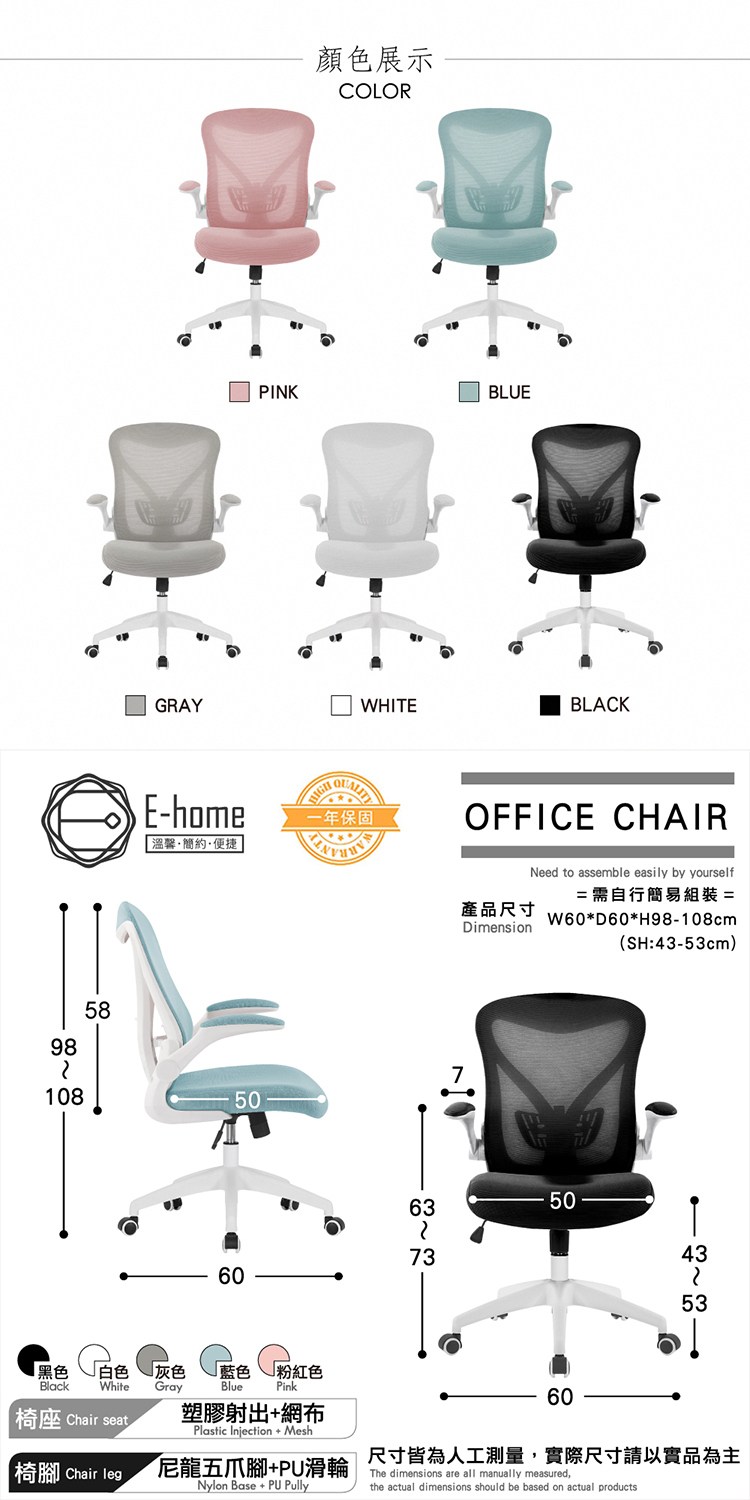 材質:塑膠射出+網布+尼龍五爪腳+PU滑輪