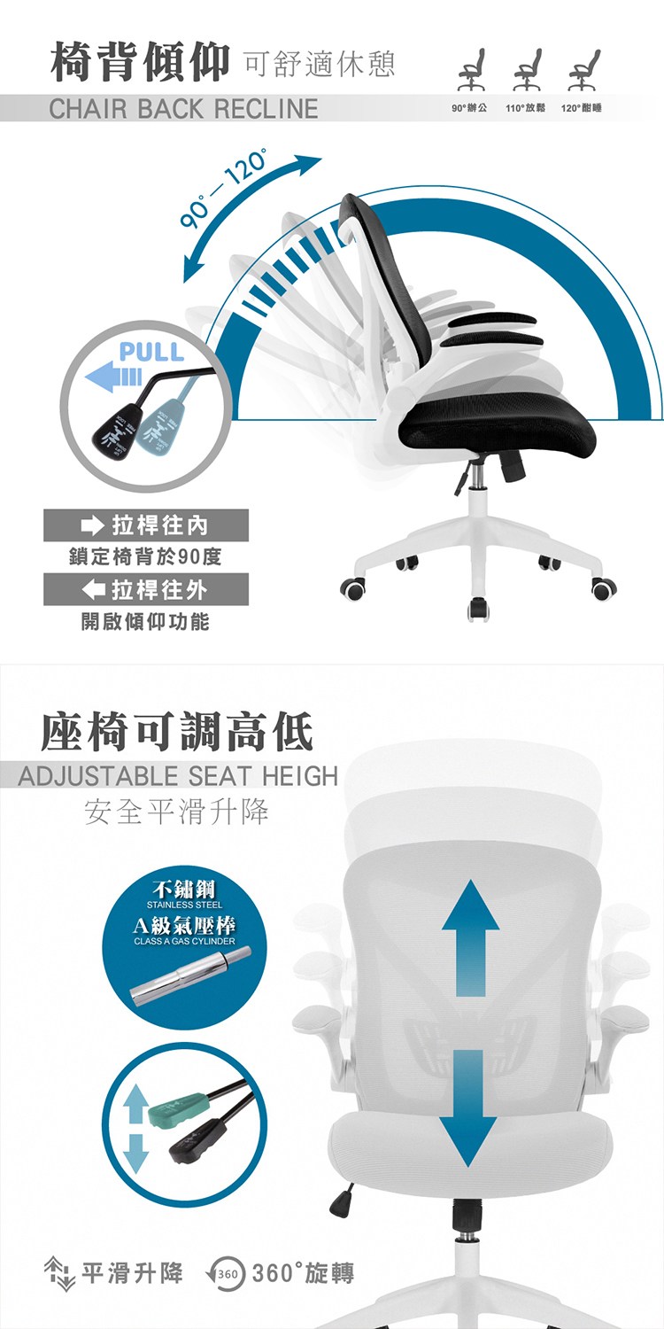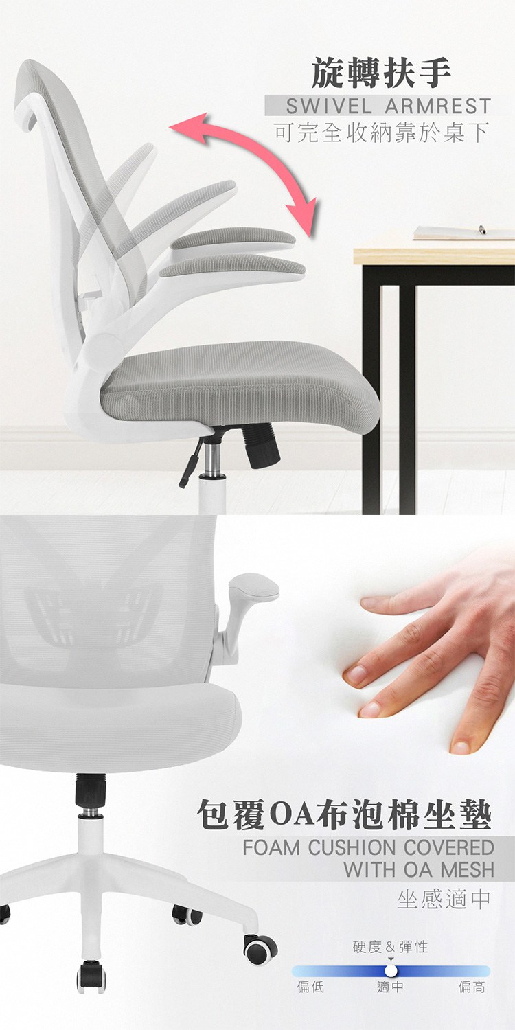 旋轉扶手,可完全收納靠於桌下,包覆OA布之泡棉坐墊、坐感適中,外拉開啟椅背傾仰,可舒適休憩,