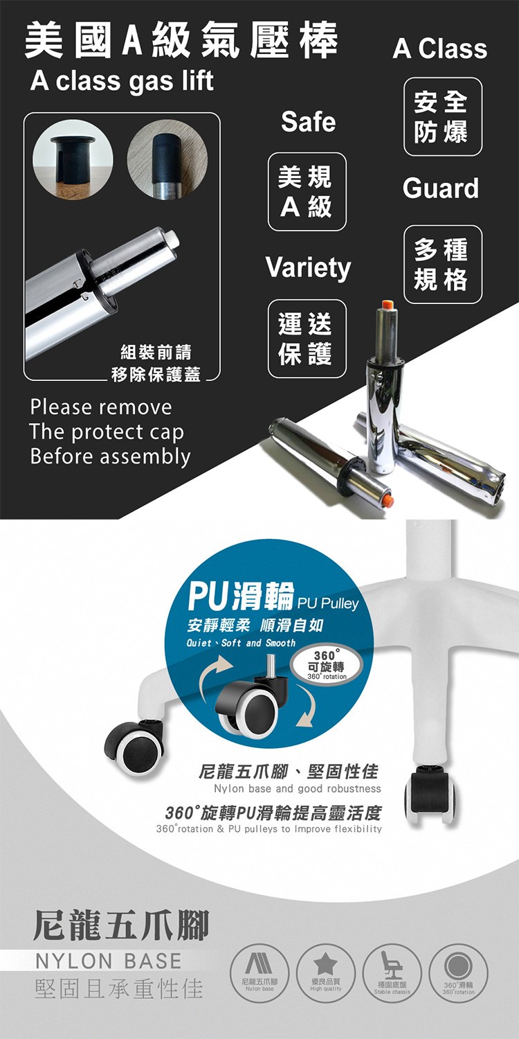 配備美規A級氣壓棒、安全升降,採尼龍五爪腳,堅固且承重性佳,360°旋轉靜音P.U.滑輪靈活移動,