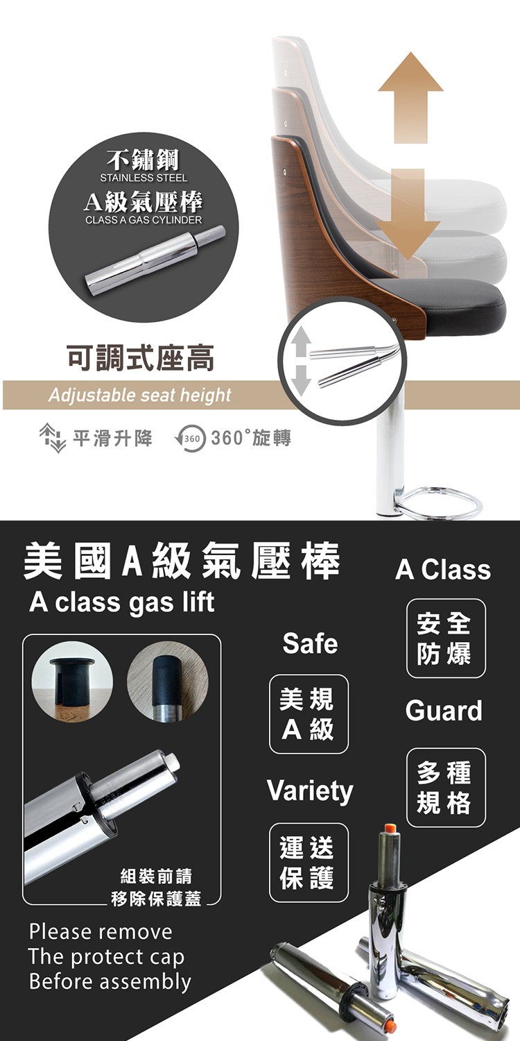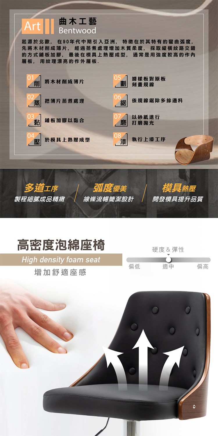 搭配獨特流線曲木框架質感加乘,厚實泡棉坐墊,增加舒適之坐感,配備美規A級氣壓棒、安全升降,