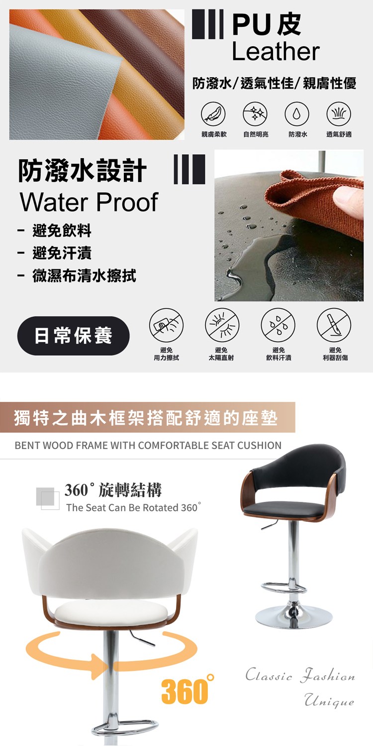 台灣與歐美同步販售、美規設計,防潑水透氣PU皮椅面,易於清潔,獨特之曲木框架搭配舒適的座墊,