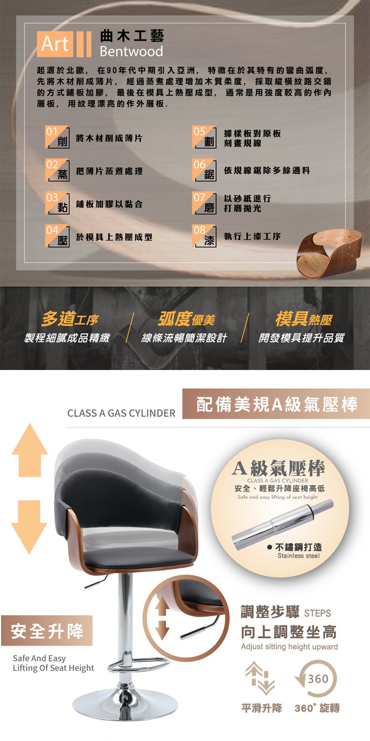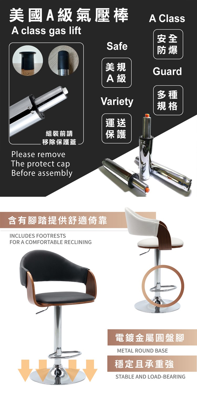配備美規A級氣壓棒、安全升降,360°旋轉含有腳踏提供舒適倚靠,電鍍金屬圓盤腳、穩定且承重強,