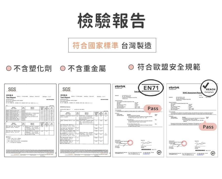 通過歐盟檢測標準,檢測內容共213項有毒物質,其中亦包含甲醯胺、塑化劑等項目全數通過。