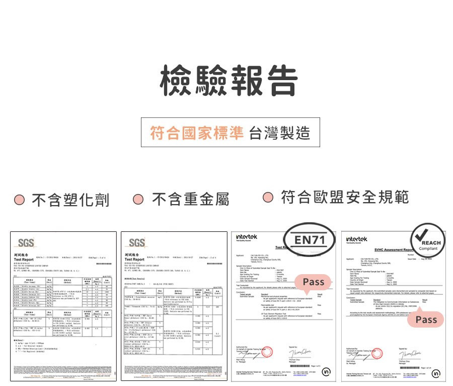 通過歐盟檢測標準,檢測內容共213項有毒物質,其中亦包含甲醯胺、塑化劑等項目全數通過。