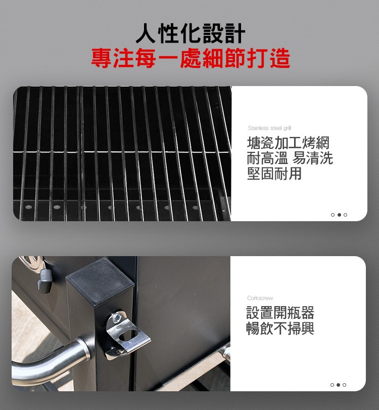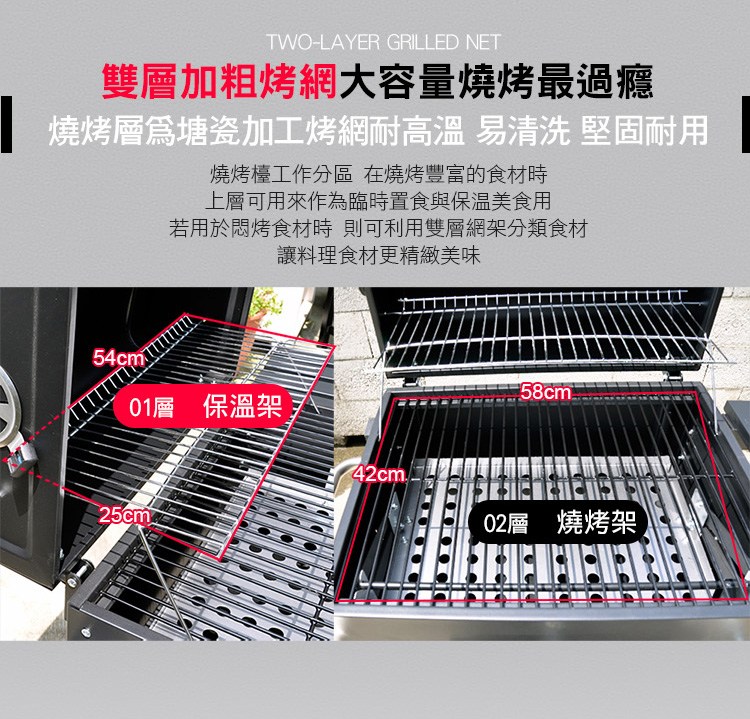 二、雙層大容量 加厚烤網 雙層加粗搪瓷烤網,大容量燒烤才夠味 烤網具有均勻受熱,物理不沾性的特點 可烤製各種美食,性能穩定
