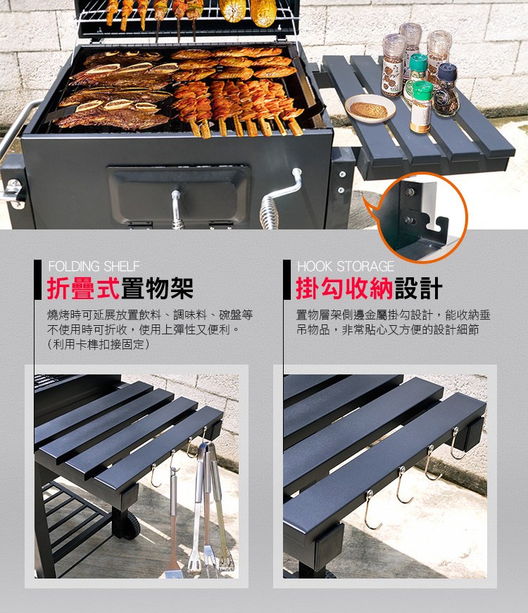 五、單側大面積折疊式置物架 燒烤時可用來放置燒烤工具和調料等 不用時亦可折疊收納,節省空間。架側設有U型掛勾,掛置烤肉夾、湯杓、鍋具相當便利