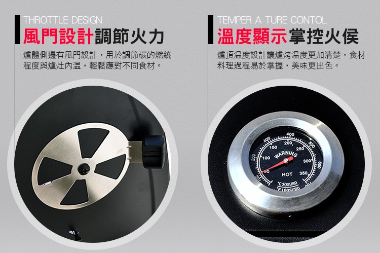 三、爐體側邊有4風門設計,用於調節碳的燃燒程度與爐內溫度 輕鬆應對不同食材,防止烤糊