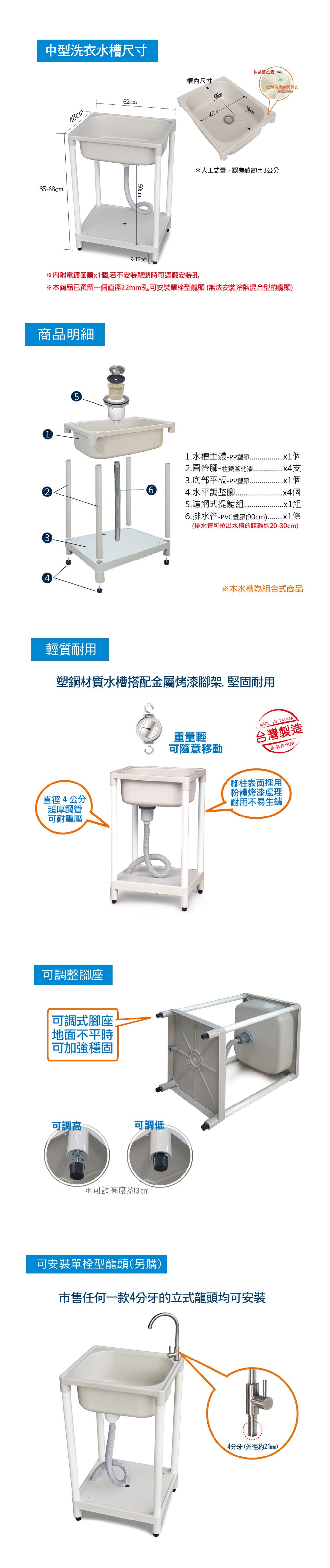 中型塑鋼洗衣槽/水槽/已預留單栓龍頭安裝孔