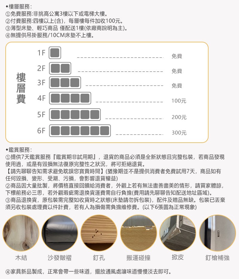 1.3樓以下+電梯免樓層費,4樓以上單購以上加收100元(含)、掀床.衣櫃及雙層床每層樓加收200元,樓層疊加。(部分衣櫃以及沙發由專員告知)