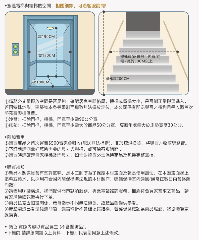 4.購買時請確定自家樓梯及門尺寸,如需退換貨必需保持商品及包裝完整無損。 (沙發:扣除門框,樓梯、門寬至少需90公分寬)