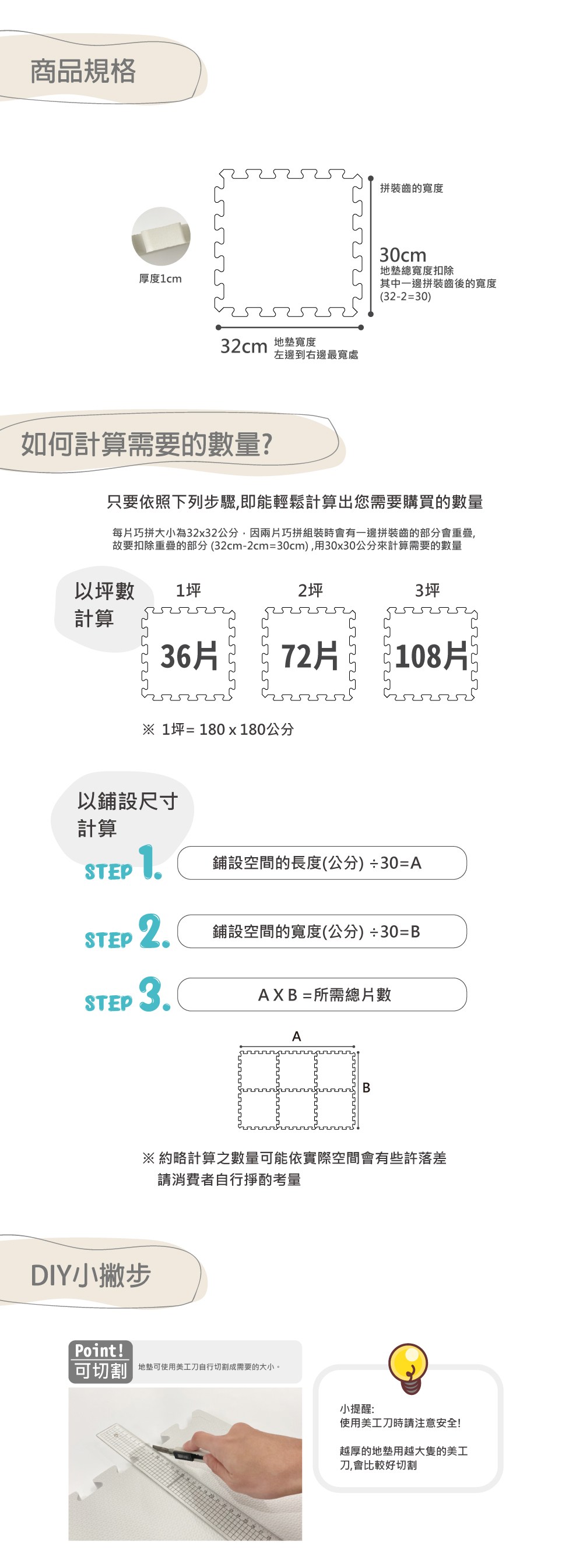 將地墊的拼裝齒互相接合即可,多餘處可以可用大型美工刀裁切成適當大小,請小心割傷