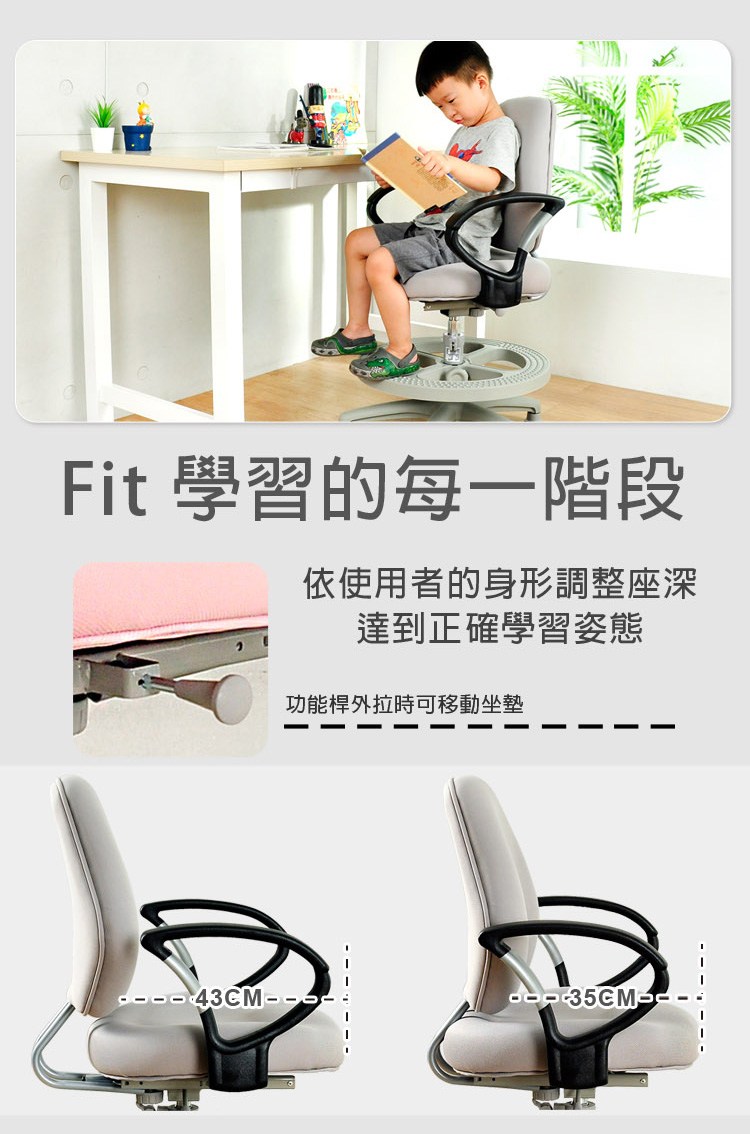 ◆坐墊可前後移動約8CM的距離,嬌小的學童可更靠近椅背端正姿勢