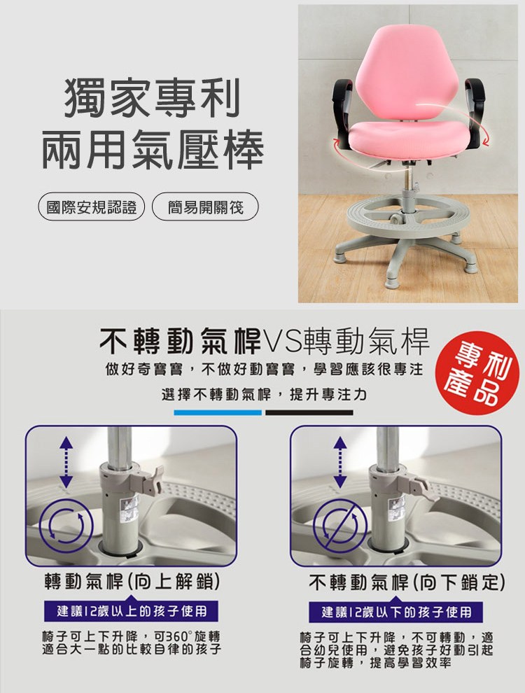 ◆台灣製專利新型開關筏六角氣壓棒,經開關筏可設定椅座可否旋轉,機構優化後操作更簡易