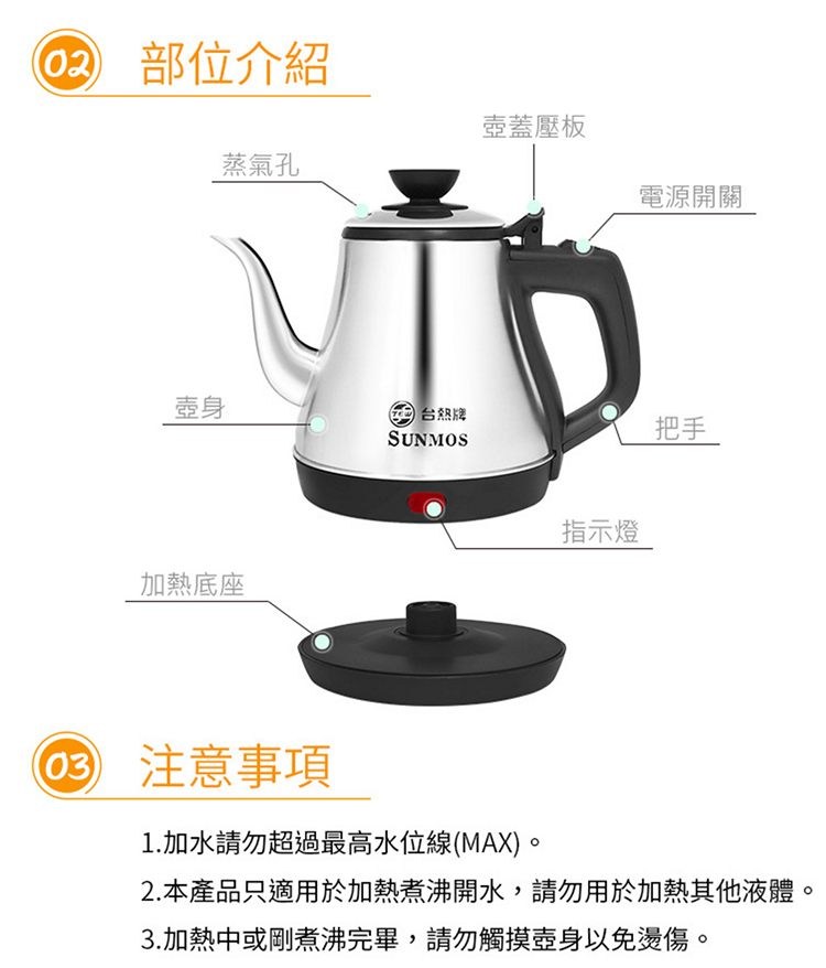 1. 本產品只適用於加熱煮沸「開水」,請勿用於加熱其他液體