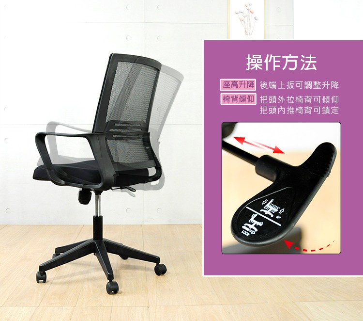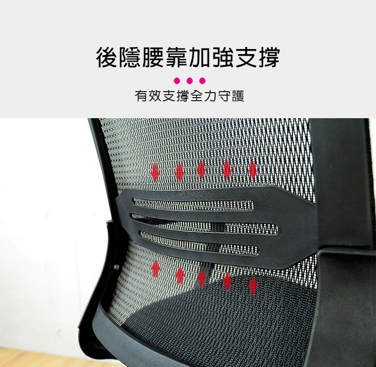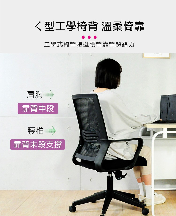 ◆ 工學椅背輔助維持正確的坐姿,保持挺直的腰桿脊椎不易歪斜