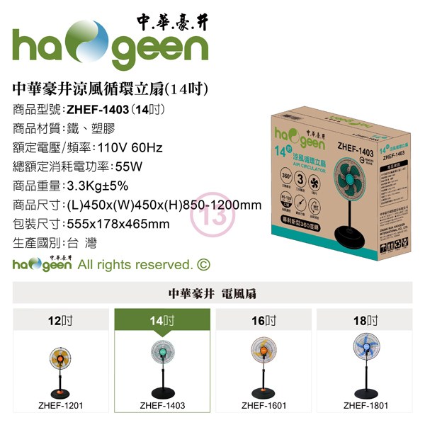 中華豪井 14吋涼風循環立扇 ZHEF-1403