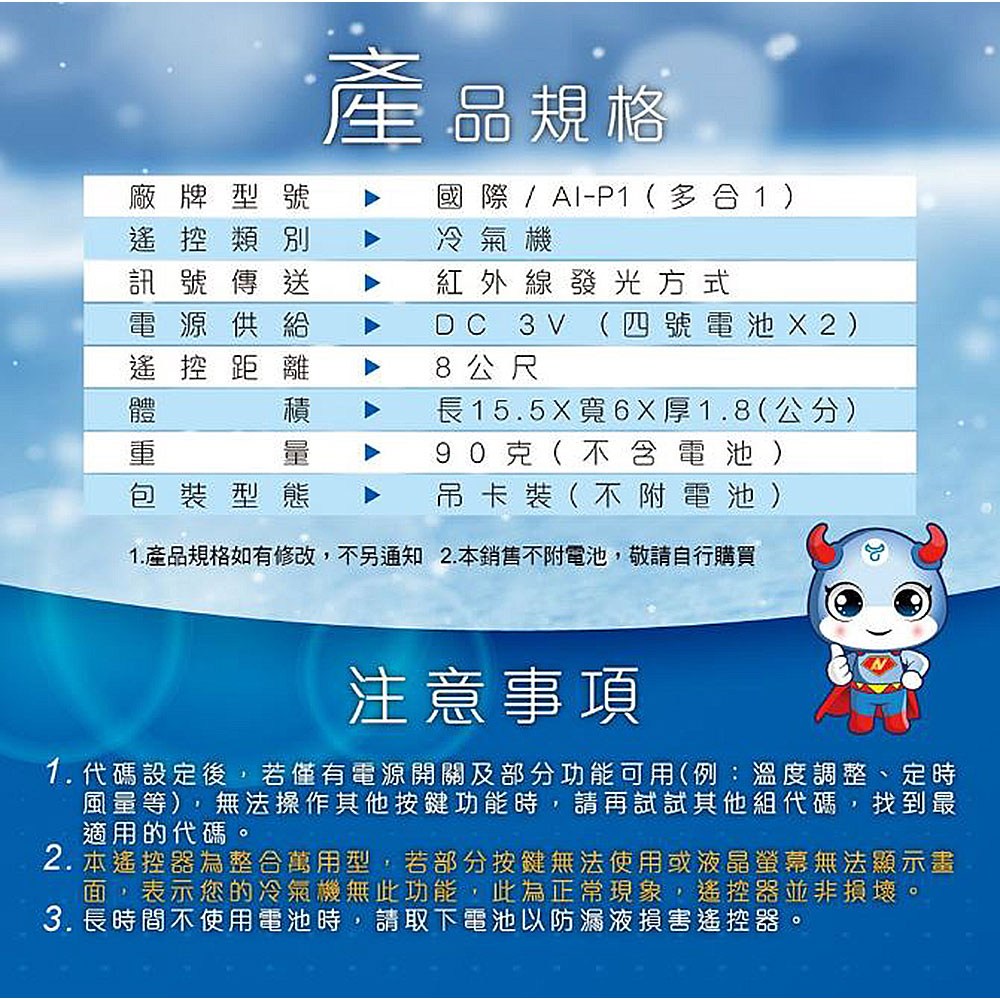 Dr.AV聖岡科技 北極熊系列 AI-P1 國際專用冷氣遙控器 1個
