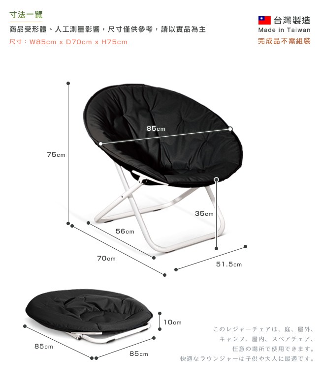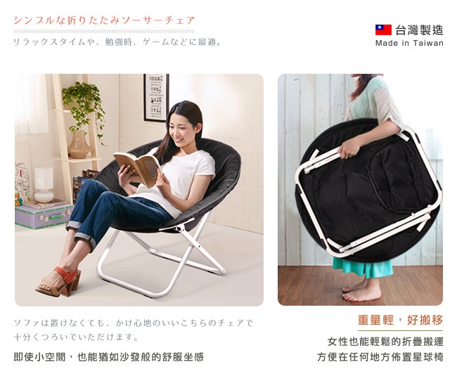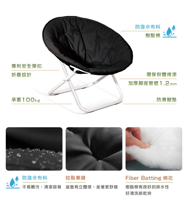 與星球的小王子,展開一場充滿純真的奇幻之旅。圓形造型的椅子,像是 Le Petit 小王子居住的快樂星球,坐在其中被完整的包覆著,獨享閒逸時光。專利安全彈扣設計,簡單輕鬆的展開、折疊星球椅,可以在客廳、臥室、書房、陽台等等任何場所佈置它。座墊是防潑水布料,與排水性良好的樹酯棉,不易髒汙,清洗容易,特別適合在露營、野餐使用。腳座加厚鐵管(中鋼原料),管徑 1 英吋、管壁 1.2mm,堅固耐用,高承重結構。防滑腳墊讓星球椅不易滑動,避免刮傷地板。