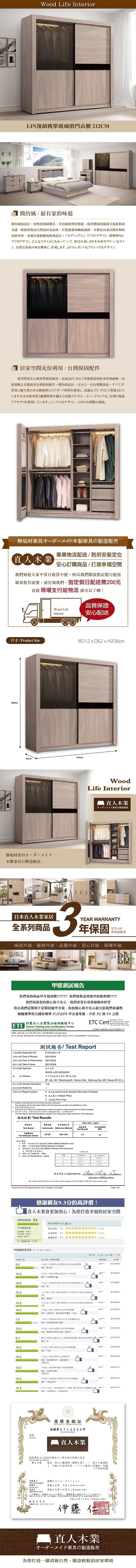 直人木業-LIN淺胡桃212CM單玻璃滑門衣櫃