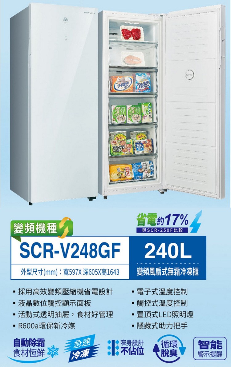 SANLUX台灣三洋240公升直立式變頻風扇無霜冷凍櫃 SCR-V248GF~含拆箱定位