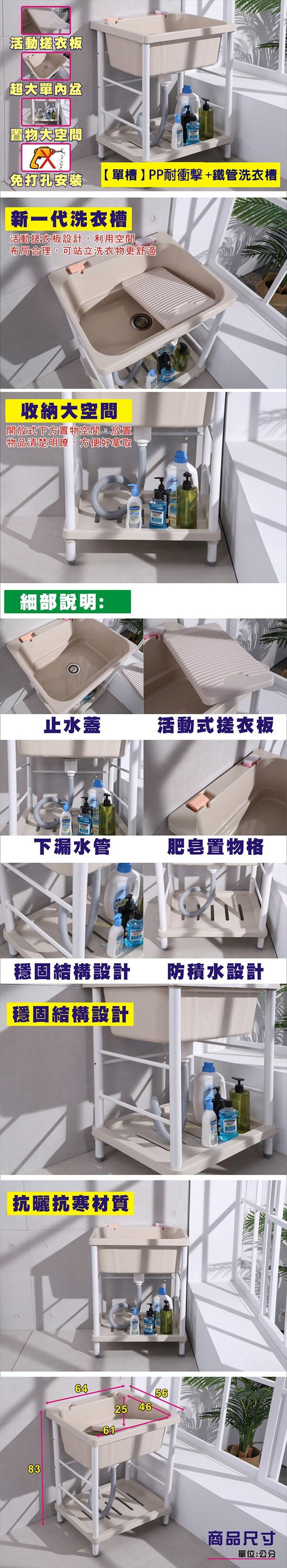 正台灣製高級品質防水防霉 塑鋼材質穩固耐用洗衣槽,可自行組裝不須找裝潢師傅 輕鬆擁有洗衣槽,側邊橫桿可披掛抹布,含活動式洗衣板方便站著洗真輕鬆 腰不痠背不痛