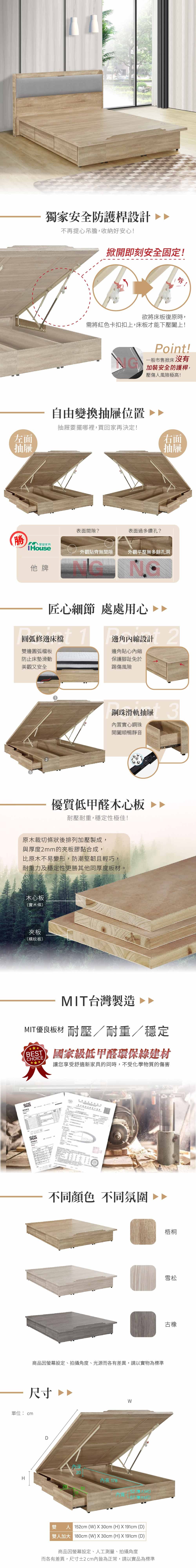 IHouse-沐森 收納抽屜+掀床床底(安全桿設計) 雙大6尺梧桐