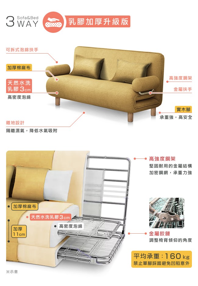 New Plus 加厚升級:天然水洗乳膠 3cm,柔軟彈性帶來良好的包覆性,服貼全身,均勻分散體壓,久睡舒適。氣孔結構,透氣不悶熱,睡感更舒服。不易凹陷變形,經久使用。加厚棉麻布,透氣、親膚性好,不易過敏。特別加厚的布料,觸感更加細膩,並提升強度與耐磨性。五段椅背快速調整,握住床墊背部,往內扳即可選擇椅背傾仰度。椅背扳過90度後,自然回檔放平,簡單變成一張床舖。高強度鋼架,堅固耐用的金屬結構。實木腳承重強,安全無虞。防刮腳墊避免刮傷木質、磁磚地板。離地設計方便打掃。可拆洗布套,定期清潔床套,避免過敏原孳生。
