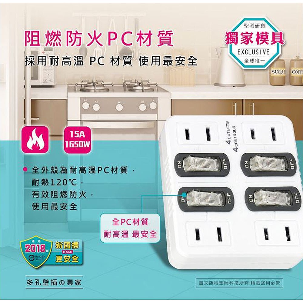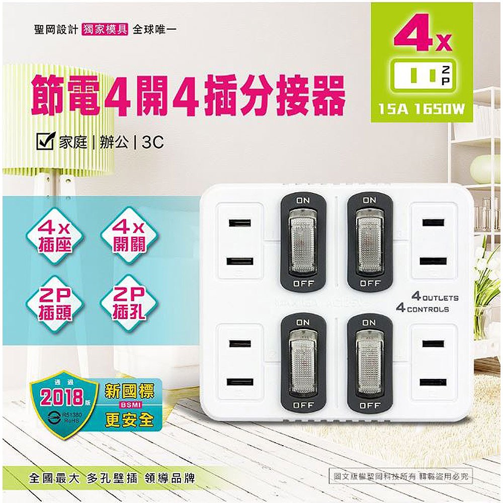 Dr.AV 聖岡科技 節電4開4插分接器 阻燃防火PC外殼 1個