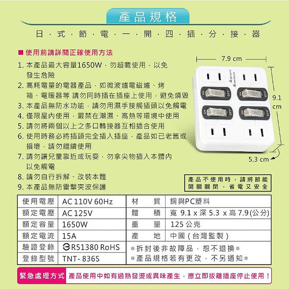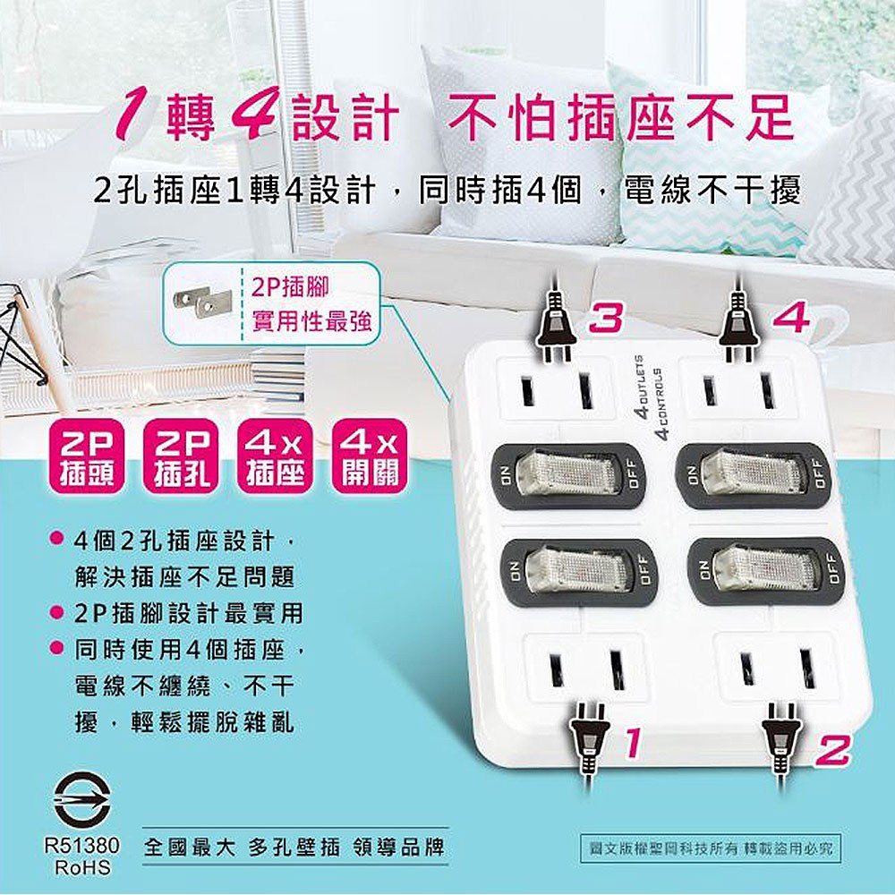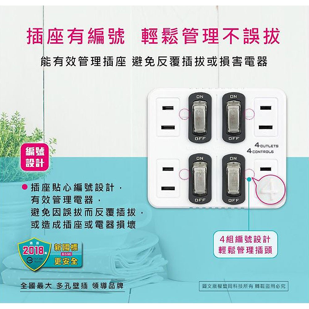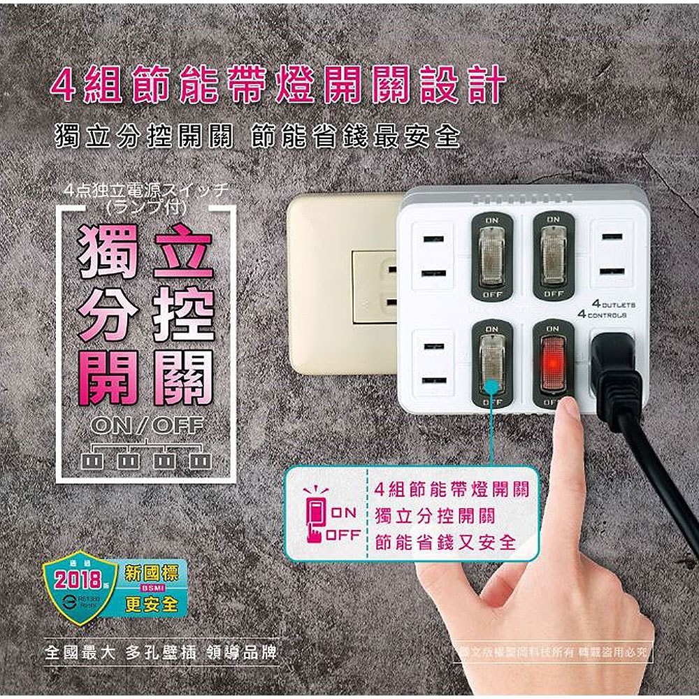 【聖岡科技Dr.AV】TNT-836S分接器4開4插(新安規 節電 獨立帶燈開關 壁插)