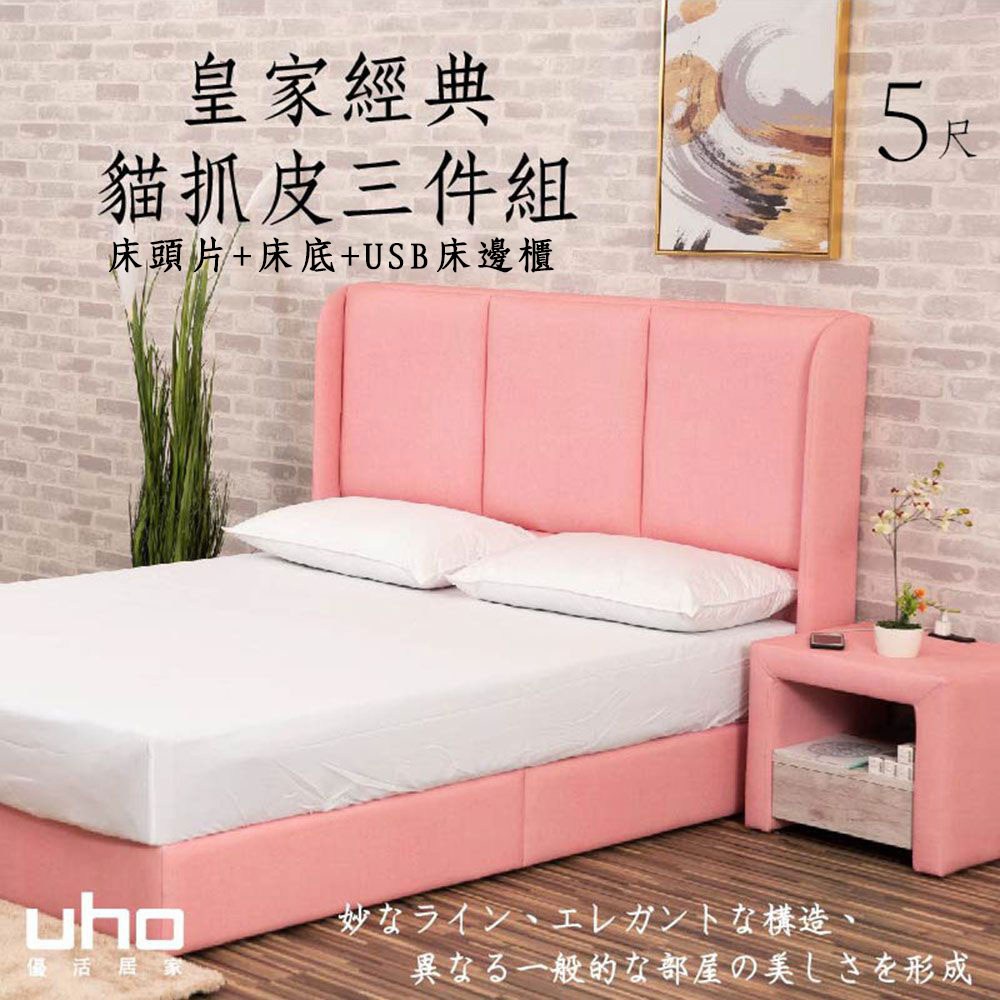 點我下載【UHO】皇家貓抓皮3件組(床頭片+床底+USB床邊櫃)-5尺雙人02米