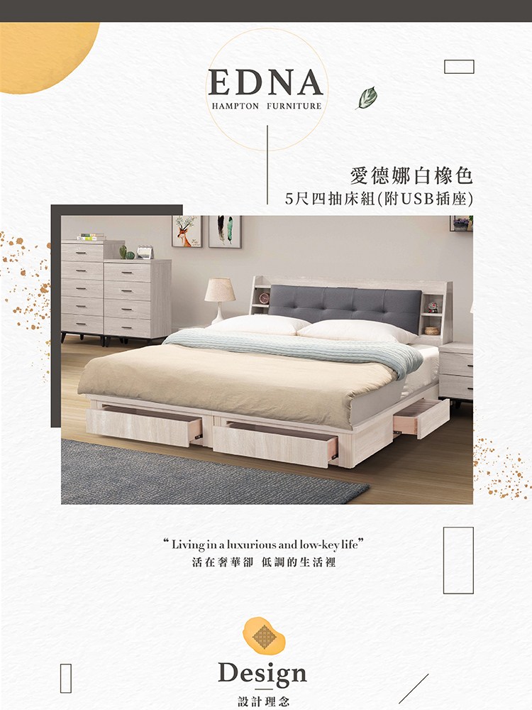 直人木業-AVERY現代輕奢風收納大四抽床組(附插座)-標準雙人5尺